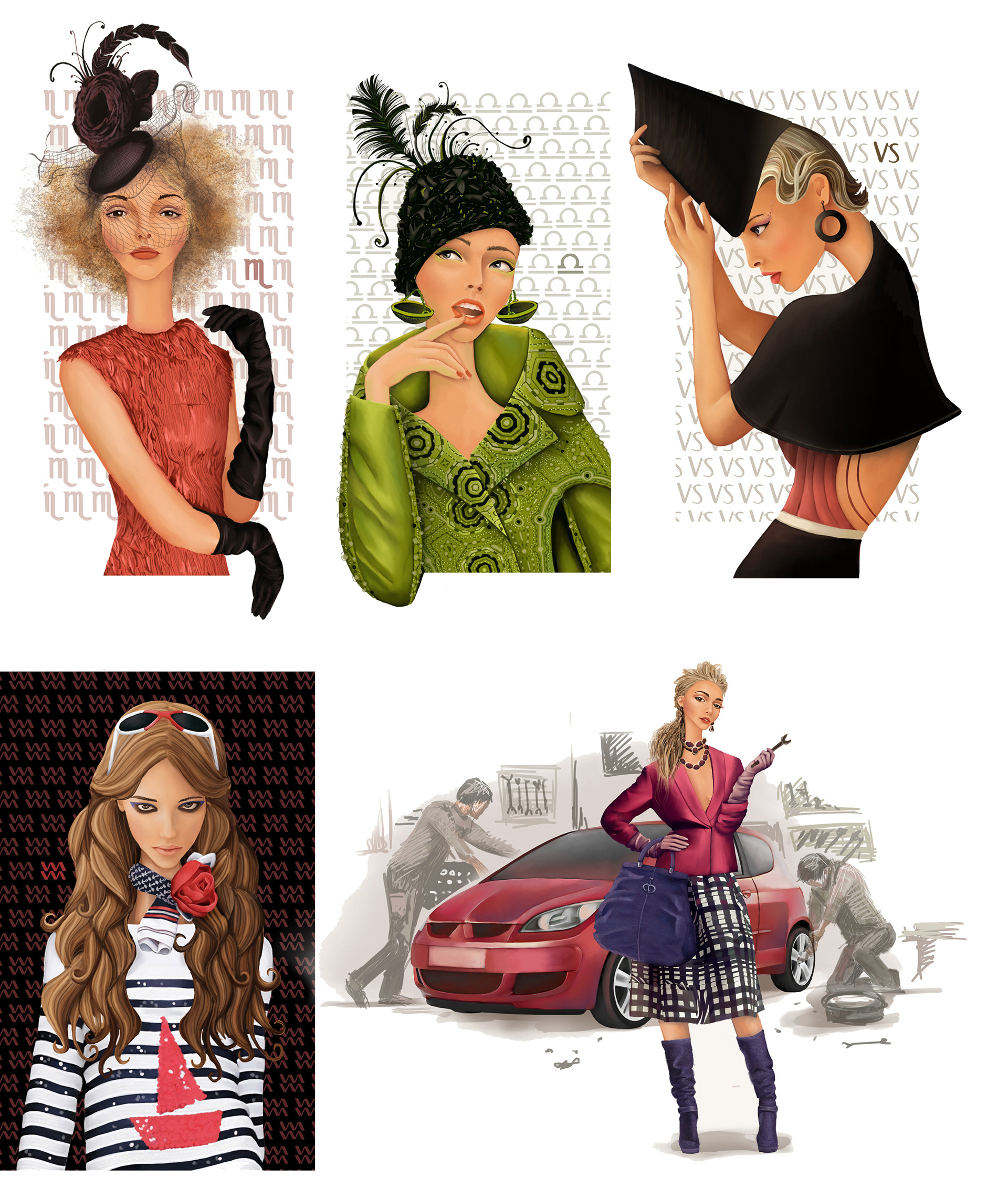 Fashion illustrations created for the monthly horoscope section and feature articles.