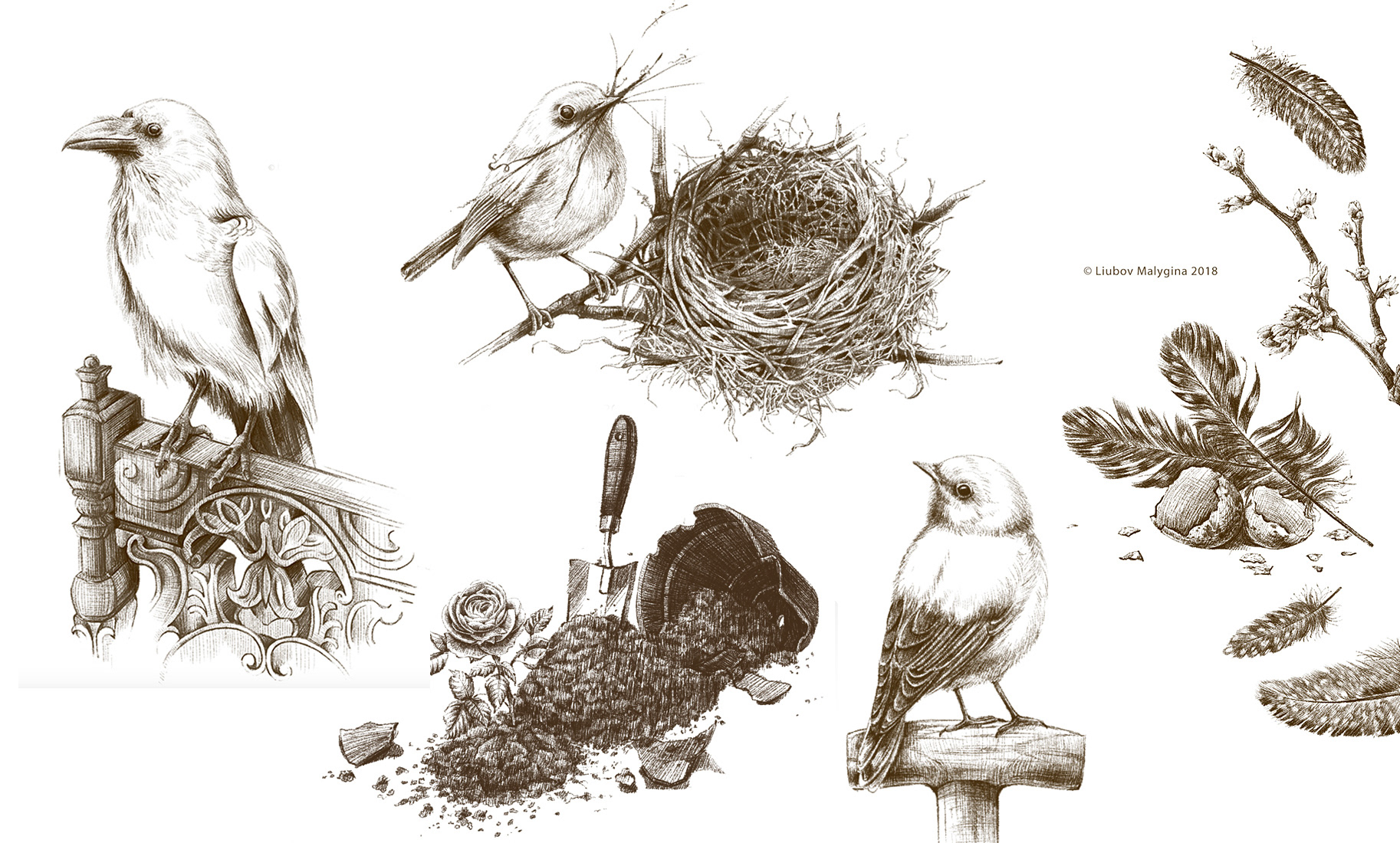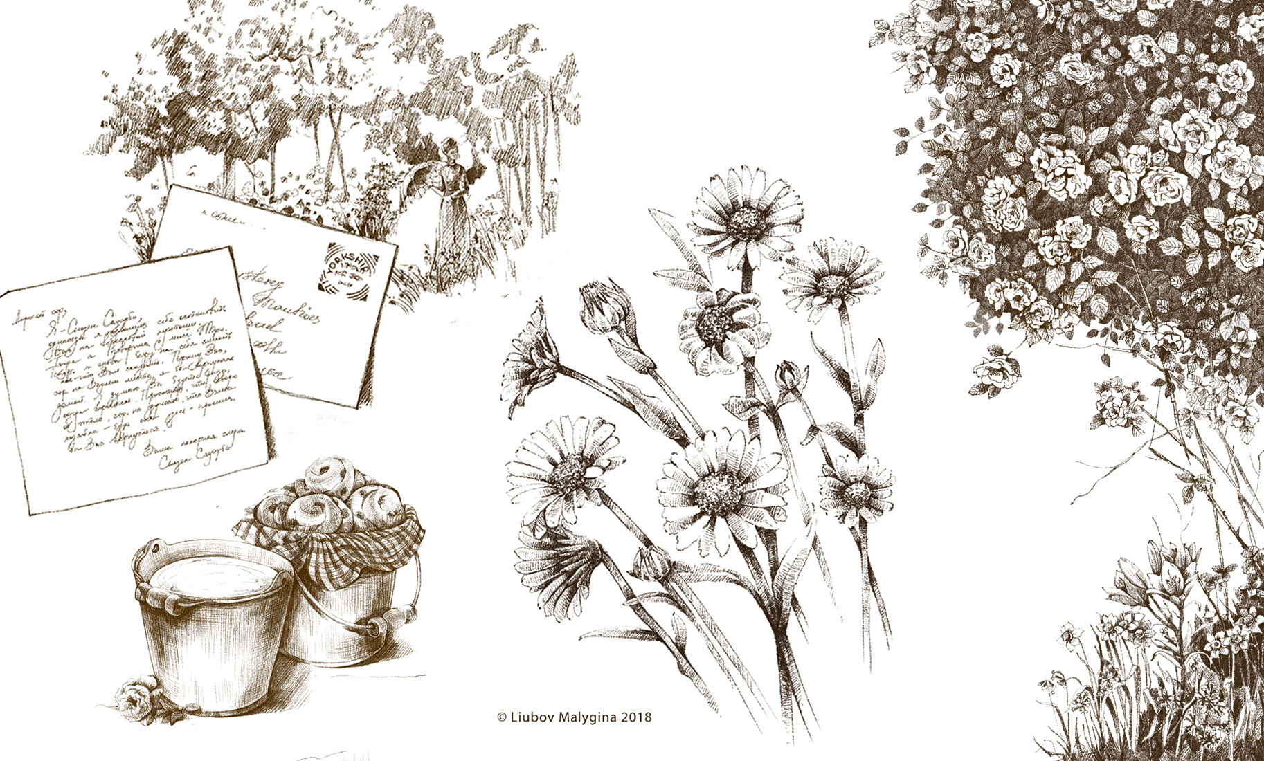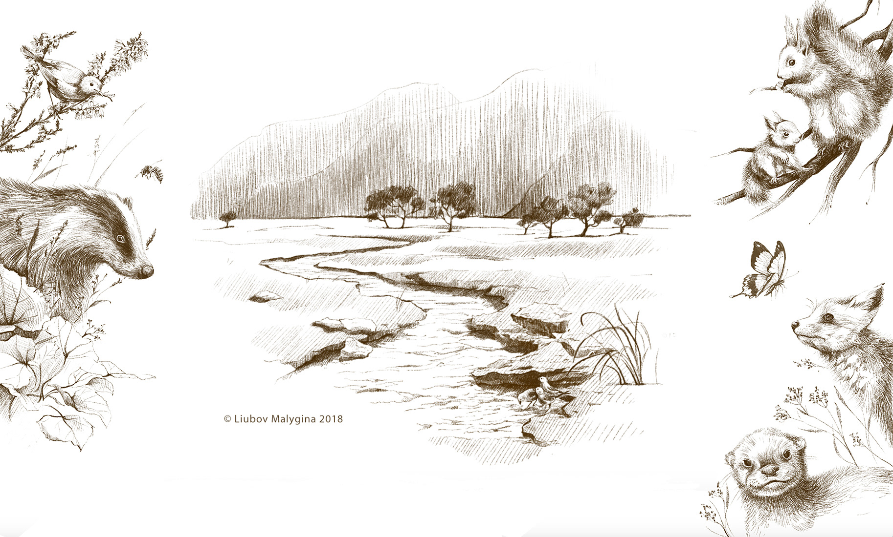 For the book, both colored watercolor illustrations and black-and-white pencil sketches were created.
