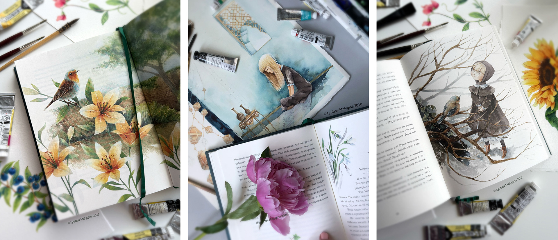 For this book, I created around 70 watercolor illustrations that bring to life the atmosphere of the old manor, nature, and the characters’ inner transformation. At the beginning of each chapter I created a floral watercolor illustration featuring plants native to England. This project was a very special journey for me into the world of childhood, nature, and renewal.