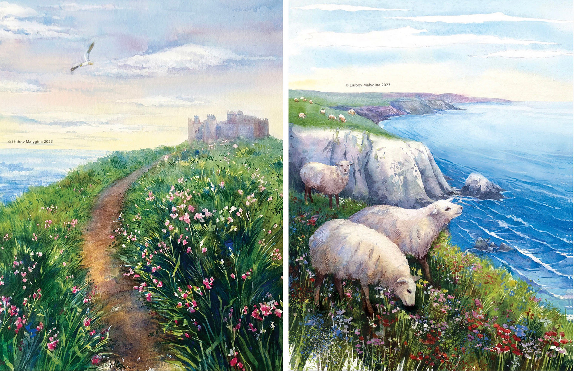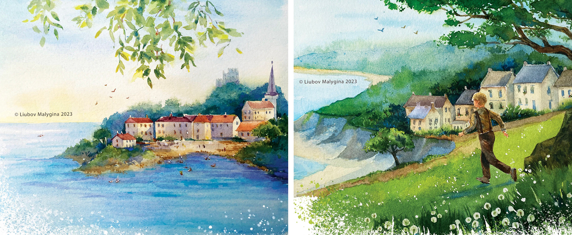 Working in traditional watercolor allowed me to bring an organic, tactile quality to these images. Layering washes of soft blues, violet and sandy ochres helped evoke the soothing rhythm of the ocean, while fine details captured the textures of shells and stones, each carrying its own story. Combining this with modern composition techniques ensured the artwork felt fresh and engaging for today’s readers.